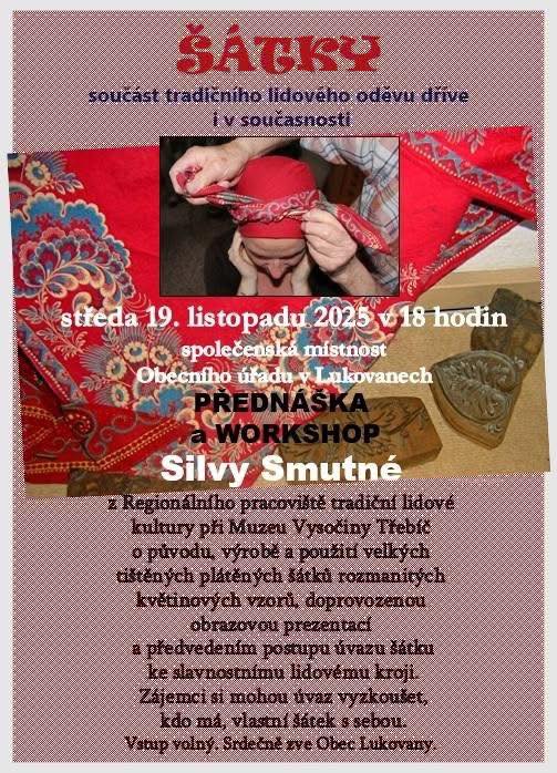 Ve středu 19. 11. 2025 se ve společenské místnostni Obecního úřadu v Lukovanech konala přednáška Silvy Smutné z Regionálního pracoviště tradiční lidové kultury v Kraji Vysočina při Muzeu Vysočiny Třebíč věnovaná tématu šátků. Zúčastnilo se jí 9 zájemkyň z řad domácích, ale také ze sousedních Rosic, které si vyzkoušely uvázání tureckého šátku tzv. na věnec.