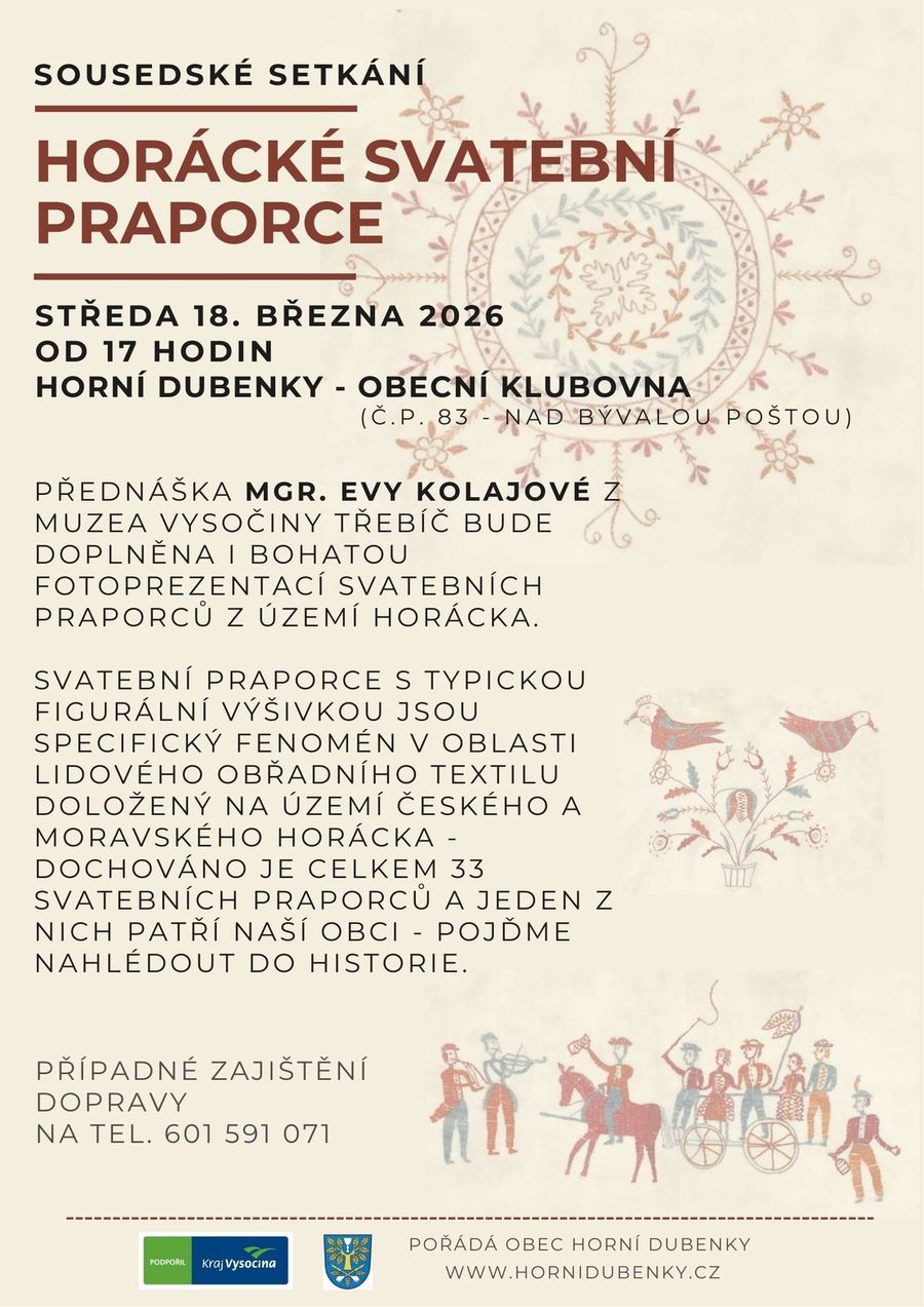 Ve středu 18. března 2026 od 17 hodin v klubovně obce Horní Dubenky proběhla přednášky Mgr. Evy Kolajové. Posluchače seznámila s tímto fenoménem z oblasti lidového obřadního textilu, pro který je typická figurální výšivka. Svatební praporce jsou doloženy na území českého a moravského Horácka, do současnosti se v muzejních fondech dochovalo celkem 33 kusů. Jedním z nich je praporec z obce Horní Dubenky. Přednáška byla doplněna o ukázku svatební praporců a panáčků ze sbírky Muzea Vysočiny Jihlava - pobočka Telč.